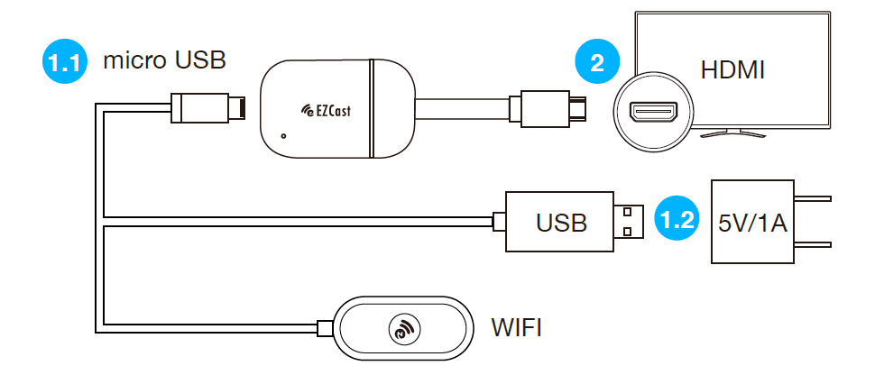 Plug the micro USB cable to EZCast dongle, and power it up by connecting USB cable to and adapter (5V/1A).