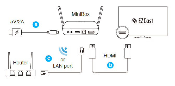 (a)Mini Box to power: Connect the DC port to power (5V/2A).