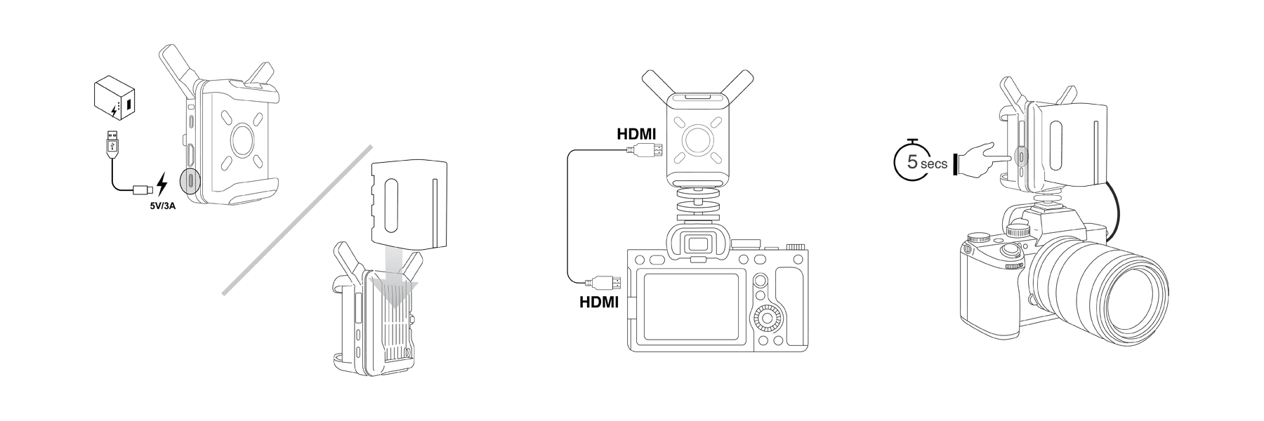 1. Use an NP-F battery or 5V/3A power supply. Connect your CamCast with an HDMI cable. Power on your CamCast by pressing the “ON/OFF” button for 5 seconds.
