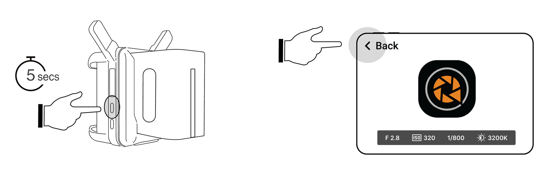 1. 使用 NP-F 电池 或 5V/3A 电源适配,通过 HDMI 线 将 CamCast 与相机连接。长按 “ON/OFF” 按钮 5 秒以开启 CamCast 电源。