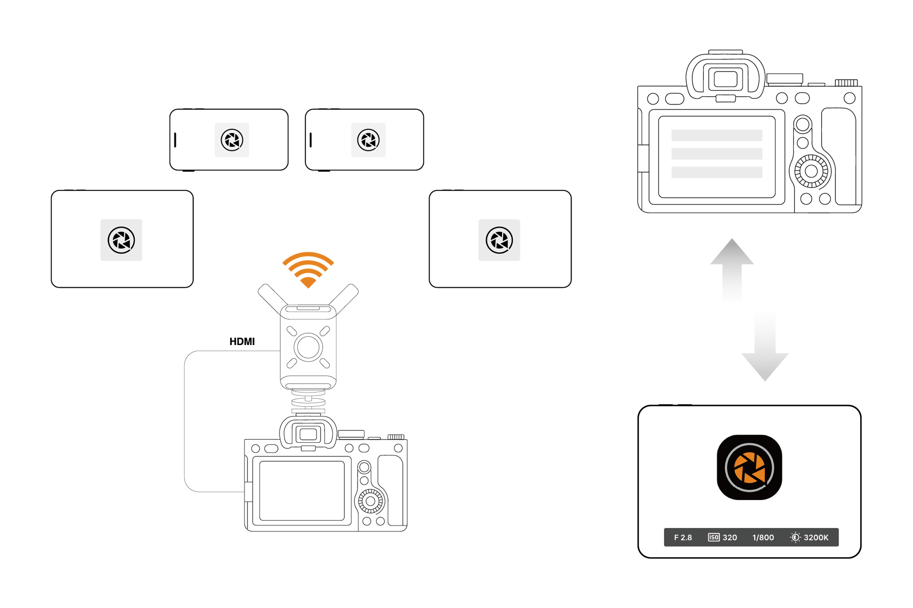 4. 您可在最多 4 個螢幕上同步查看攝影機的即時影像。若透過資料傳輸線將攝影機與 CamCast 相連,即可啟用 PTP 遠端控制功能。